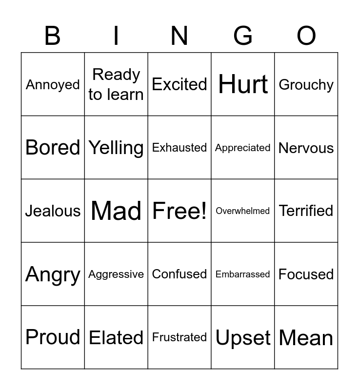 This bingo card has a free space and 30 words: Elated, Out of Control, Mad, Uncomfortable, Annoyed, Excited, Yelling, Confused, Overwhelmed, Frustrated, Terrified, Mean, Upset, Silly, Nervous, Scared, Embarrassed, Angry, Aggressive, Grouchy, Jealous, Worried, Ready to learn, Appreciated, Bored, Hurt, Focused, Proud, Exhausted and Sad.