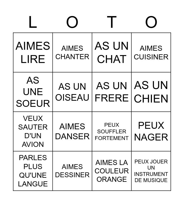 This bingo card has 16 words: AIMES DESSINER, PEUX NAGER, AS UN CHAT, AIMES LIRE, VEUX SAUTER D'UN AVION, AIMES CHANTER, PEUX SOUFFLER FORTEMENT, AIMES LA COULEUR ORANGE, AS UNE SOEUR, AS UN OISEAU, PARLES PLUS QU'UNE LANGUE, AIMES CUISINER, AIMES DANSER, AS UN CHIEN, AS UN FRERE and PEUX JOUER UN INSTRUMENT DE MUSIQUE.