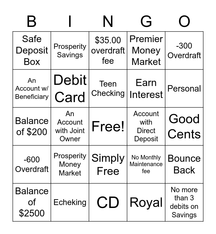 This bingo card has a free space and 24 words: Prosperity Money Market, Echeking, Teen Checking, Balance of $2500, -300 Overdraft, Safe Deposit Box, An Account w/ Beneficiary, Prosperity Savings, Account with Direct Deposit, Simply Free, Earn Interest, Balance of $200, No Monthly Maintenance fee, Bounce Back, Debit Card, Royal, Good Cents, $35.00 overdraft fee, Personal, An Account with Joint Owner, No more than 3 debits on Savings, -600 Overdraft, Premier Money Market and CD.