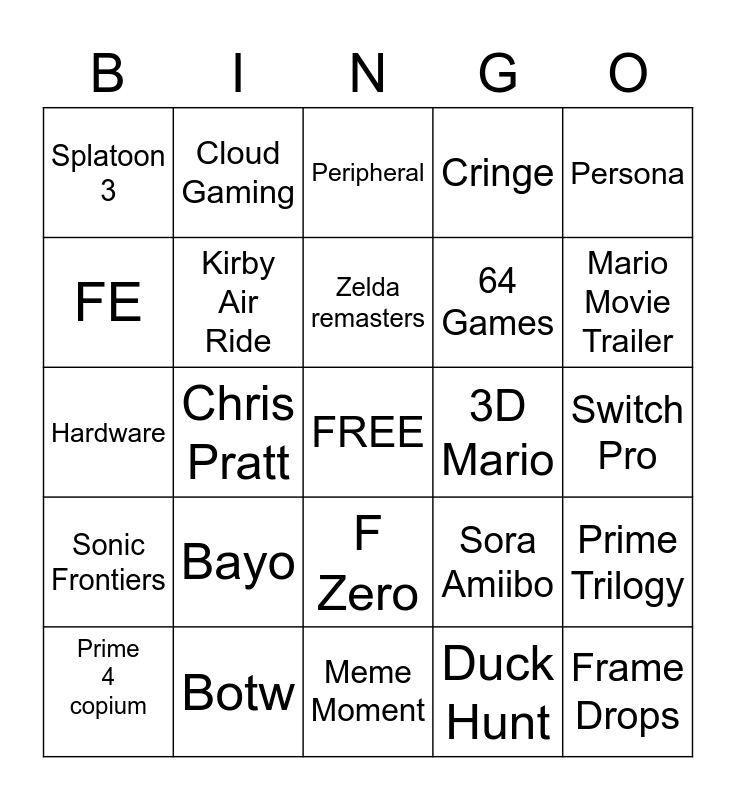 This bingo card has a free space and 24 words: Bayo, Botw, Zelda remasters, Prime 4 copium, Persona, Splatoon 3, FE, Cloud Gaming, 3D Mario, F Zero, 64 Games, Hardware, Sora Amiibo, Prime Trilogy, Kirby Air Ride, Duck Hunt, Switch Pro, Peripheral, Mario Movie Trailer, Chris Pratt, Frame Drops, Sonic Frontiers, Cringe and Meme Moment.