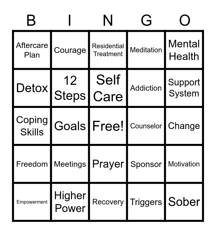 This bingo card has a free space and 24 words: Meetings, Higher Power, Self Care, Empowerment, Mental Health, Aftercare Plan, Detox, Courage, Counselor, Prayer, Addiction, Coping Skills, Sponsor, Motivation, 12 Steps, Triggers, Change, Residential Treatment, Support System, Goals, Sober, Freedom, Meditation and Recovery.
