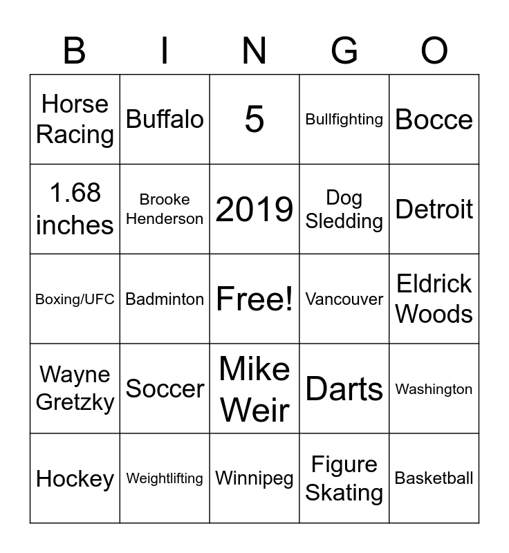 This bingo card has a free space and 75 words: 2, 4, 5, 6, 7, 9, 11, 13, 14, 18, 1988, 2010, 2019, 1.68 inches, Augusta National, Badminton, Baseball, Basketball, Billiards/Pool, Bocce, Boston, Boxing/UFC, Brooke Henderson, Buffalo, Bullfighting, Calgary, Canadian Open, Chicago, Claret Jug, Condor, Cricket, Curling, Dallas, Darts, Detroit, Dog Sledding, Driver, Edmonton, Eldrick Woods, Figure Skating, Football, Golf, Greg Norman, Grey Cup, Gymnastics, High Jump, Hockey, Horse Racing, Horseshoes, Lacrosse, Michael Jordan, Mike Weir, Montreal, Ottawa, Regina, Rodeo, Rowing, Rugby, San Antonio, Skiing, Soccer, St. Andrews, Swimming, Tennis, Toronto Blue Jays, Vancouver, Victoria, Volleyball, Wannamaker, Washington, Wayne Gretzky, Weightlifting, Whitehorse, Winnipeg and Wrestling.