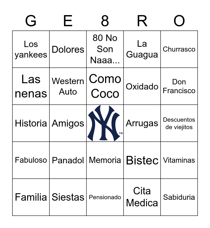 This bingo card has a free space and 26 words: Memoria, Cita Medica, Como Coco, Siestas, Churrasco, Los yankees, Las nenas, Dolores, Descuentos de viejitos, Bistec, Oxidado, Historia, Vitaminas, Familia, Amigos, Guaynabo, La Guagua, Fabuloso, 80 No Son Naaa..., Sabiduria, Don Francisco, Pensionado, Arrugas, Panadol, Western Auto and Arroz.