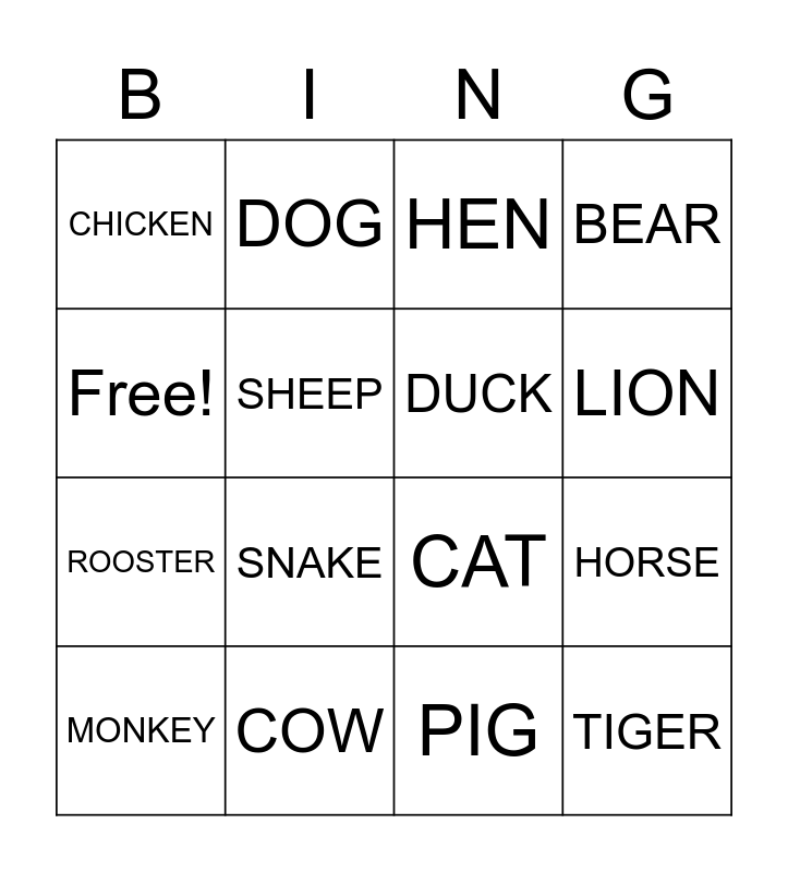 This bingo card has 16 words: COW, HORSE, HEN, CHICKEN, ROOSTER, DOG, CAT, PIG, Free!, SHEEP, MONKEY, BEAR, SNAKE, LION, DUCK and TIGER.