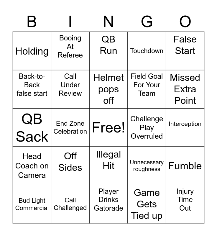 This bingo card has a free space and 24 words: Off Sides, Call Challenged, Helmet pops off, Bud Light Commercial, False Start, Holding, Back-to-Back false start, Booing At Referee, Challenge Play Overruled, Illegal Hit, Field Goal For Your Team, QB Sack, Unnecessary roughness, Fumble, Call Under Review, Game Gets Tied up, Interception, QB Run, Missed Extra Point, End Zone Celebration, Injury Time Out, Head Coach on Camera, Touchdown and Player Drinks Gatorade.