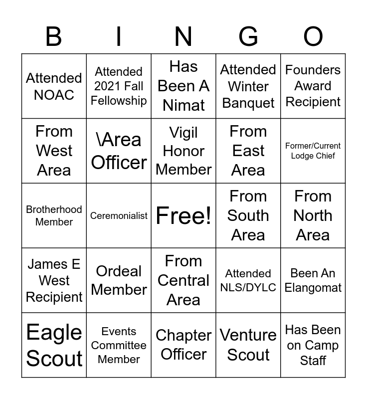 This bingo card has a free space and 24 words: Ordeal Member, Events Committee Member, Vigil Honor Member, Eagle Scout, Founders Award Recipient, Attended NOAC, From West Area, Attended 2021 Fall Fellowship, From South Area, From Central Area, From East Area, Brotherhood Member, Attended NLS/DYLC, Been An Elangomat, \Area Officer, Venture Scout, From North Area, Has Been A Nimat, Former/Current Lodge Chief, Ceremonialist, Has Been on Camp Staff, James E West Recipient, Attended Winter Banquet and Chapter Officer.