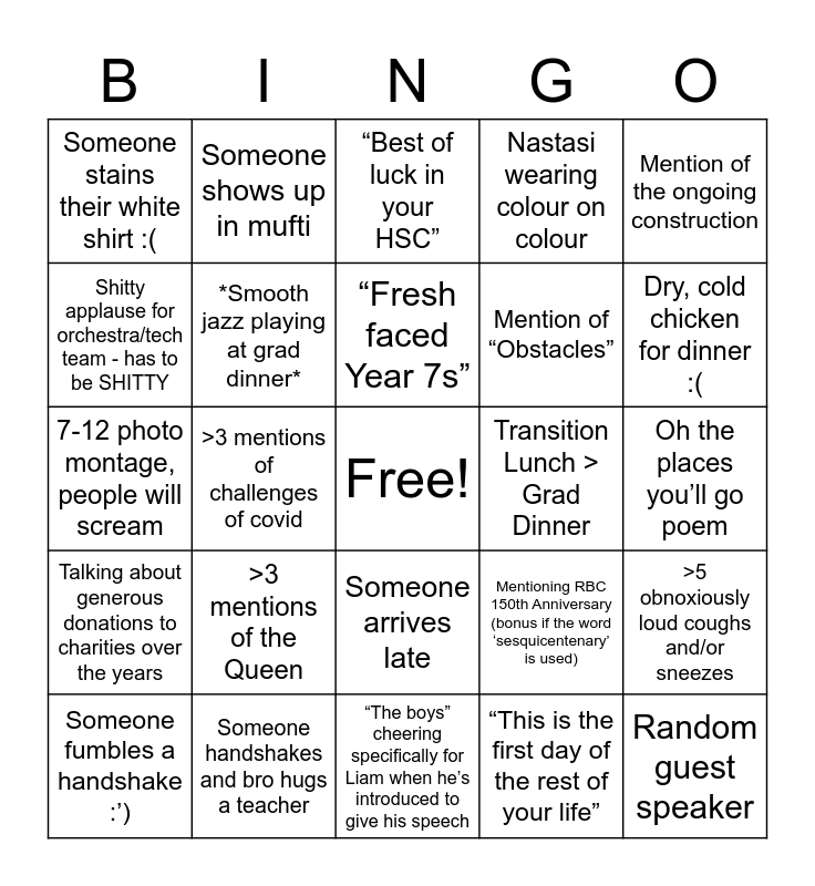 This bingo card has a free space and 75 words: “This is only the beginning of your journey”, B e n e d i c t i n e v a l u e s, “Best of luck in your HSC”, “HSC/ATAR doesn’t define you”, “Everybody is a leader”, >3 people thanked, Parents specially mentioned, “This is rosebank”, “Sense of occasion”, 13 years of schooling, Mr Murphy says “520 weeks of schooling”, Mention of school culture/spirit, “Fresh faced Year 7s”, Shitty applause for orchestra/tech team - has to be SHITTY, Murphy making a sport reference, >3 mentions of challenges of covid, “The real work starts now”, Random guest speaker, Mr Galea cameo, Mention of the ongoing construction, “It’s not a sprint it’s a marathon”, 7-12 photo montage, people will scream, *Smooth jazz playing at grad dinner*, Someone shows up in mufti, Nastasi wearing colour on colour, Mass goes over by at least 20 mins, Historical Story by Nastasi - BLACK MAGGY, “I won’t talk for too long”, “I speak on behalf of…”, “We have watched you grow”, “It feels like yesterday”, We’re gifted some miscellaneous object (e.g keychain), A cake with the rosebank emblem, Mentioning RBC 150th Anniversary (bonus if the word ‘sesquicentenary’ is used), Dry, cold chicken for dinner :(, Mention of “Obstacles”, Phone going off, “Don’t be afraid of failure”, Oh the places you’ll go poem, “This is the first day of the rest of your life”, “Start a new chapter”, *Mispronounced name*, Reference to stress of high school, Weird flowery metaphor, “Like the young men and women that came before you”, “Never stop learning”, Someone fumbles a handshake :’), Someone stains their white shirt :(, Mention of comfort zone, Quote from famous person, Awkward joke, Someone arrives late, “When i sat down to write this speech”, “if you had told me…”, Blessing of students, “God bless <3”, “Last leg of race’”, “HSC is still ahead of you”, “Can the three young boys in the front stay back after the mass”, One of the speakers is away, >3 mentions of the Queen, Someone’s parent starts screaming when they see their kid, Parent starts crying (happy or sad tears is up to interpretation), Technical issues (ouch), One parent stands up to take photos (bonus points for flash/portrait mode), Transition Lunch > Grad Dinner, “Unprecedented times”, Choir singing too loud or too quiet no inbetween (can confirm as someone in choir), Someone shakes Ms Nasatasi hand too hard and her arm flails like a wacky waving inflatable tube man, >5 obnoxiously loud coughs and/or sneezes, Talking about generous donations to charities over the years, Someone handshakes and bro hugs a teacher, “HSC is not an IQ test, it’s a test of resilience” - Nastasi, “The boys” cheering specifically for Liam when he’s introduced to give his speech and Someone falling asleep.