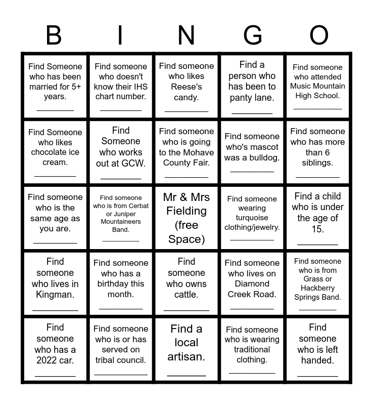 This bingo card has a free space and 24 words: Find someone who has a birthday this month. _________, Find someone who is or has served on tribal council. ___________, Find someone who is going to the Mohave County Fair. _________, Find someone who has a 2022 car. ________, Find someone who attended Music Mountain High School. ___________, Find Someone who has been married for 5+ years. ________, Find Someone who likes chocolate ice cream. _________, Find someone who doesn't know their IHS chart number. _________, Find someone wearing turquoise clothing/jewelry. __________, Find someone who owns cattle. _________, Find someone who's mascot was a bulldog. _________, Find someone who is the same age as you are. _________, Find someone who lives on Diamond Creek Road. _________, Find someone who is from Grass or Hackberry Springs Band. _________, Find Someone who works out at GCW. ________, Find someone who is wearing traditional clothing. __________, Find a child who is under the age of 15. ________, Find someone who likes Reese's candy. _________, Find someone who has more than 6 siblings. _________, Find someone who is from Cerbat or Juniper Mountaineers Band. __________, Find someone who is left handed. ________, Find someone who lives in Kingman. _________, Find a person who has been to panty lane. ________ and Find a local artisan. ______.