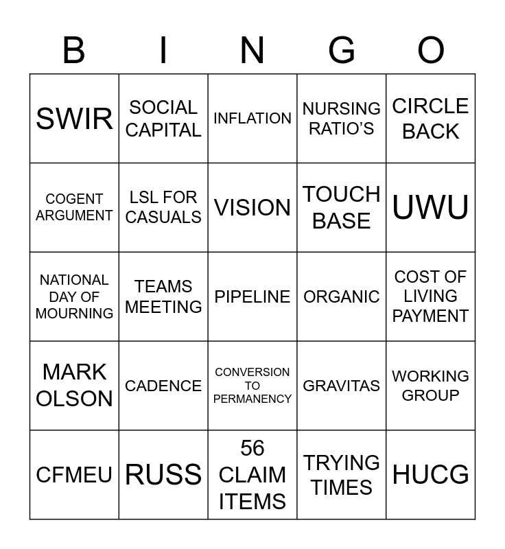 This bingo card has 48 words: DPC, PIPELINE, LEARNINGS, 56 CLAIM ITEMS, CADENCE, BLUEPRINT, SOCIAL CAPITAL, HORIZONTAL AND VERTICAL ASSESSMENT, COGENT ARGUMENT, PROPELLING, LSL FOR CASUALS, NURSING RATIO’S, WORKING GROUP, GRAVITAS, SYNERGISTIC, GOING FORWARD, VISION, ORGANIC, DYNAMIC, CIRCLE BACK, TEAMS MEETING, TRYING TIMES, SWIR, TOUCH BASE, ANF, UWU, CFMEU, HSU, CONVERSION TO PERMANENCY, MARK OLSON, NAOMI MCCRAE, DUNCAN-SMITH, ANGELA KELLY, NICOLE O’KEEFE, RUSS, MARK MCGOWAN, COVID-19, COST OF LIVING PAYMENT, INFLATION, WAGE INCREASE, AMA, HUCG, INFLATION, BUDGETS, NATIONAL DAY OF MOURNING, WORKING FROM HOME, PLAY IT BY EAR and SWAMPED.