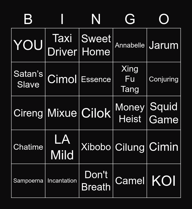 This bingo card has a free space and 24 words: Sampoerna, LA Mild, Essence, Camel, Jarum, YOU, Taxi Driver, Sweet Home, Money Heist, Squid Game, Cireng, Cimol, Cilung, Cimin, Satan’s Slave, Incantation, Don't Breath, Annabelle, Conjuring, Chatime, Mixue, Xibobo, Xing Fu Tang and KOI.