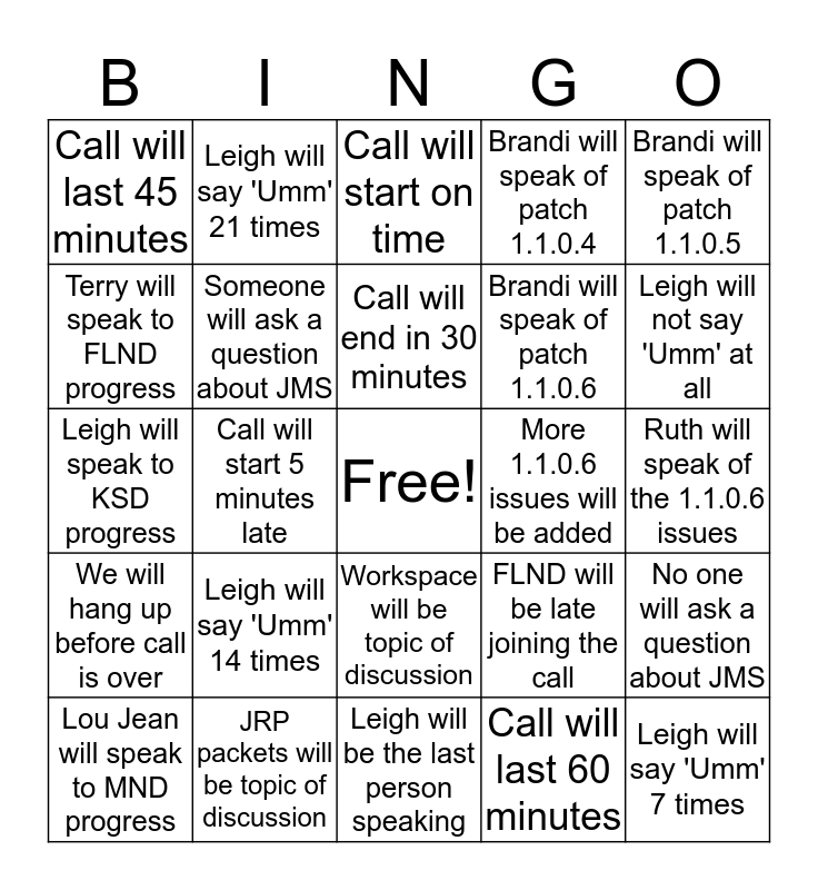 This bingo card has a free space and 24 words: Leigh will say 'Umm' 14 times, JRP packets will be topic of discussion, Call will end in 30 minutes, Lou Jean will speak to MND progress, Brandi will speak of patch 1.1.0.5, Call will last 45 minutes, Terry will speak to FLND progress, Leigh will say 'Umm' 21 times, More 1.1.0.6 issues will be added, Workspace will be topic of discussion, Brandi will speak of patch 1.1.0.6, Leigh will speak to KSD progress, FLND will be late joining the call, No one will ask a question about JMS, Someone will ask a question about JMS, Call will last 60 minutes, Ruth will speak of the 1.1.0.6 issues, Call will start on time, Leigh will not say 'Umm' at all, Call will start 5 minutes late, Leigh will say 'Umm' 7 times, We will hang up before call is over, Brandi will speak of patch 1.1.0.4 and Leigh will be the last person speaking.