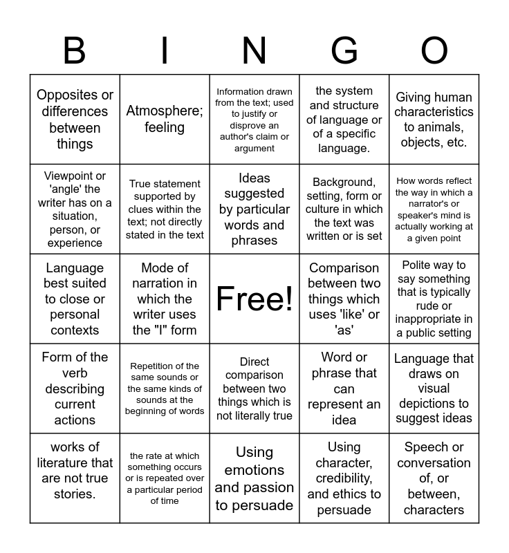 This bingo card has a free space and 24 words: Repetition of the same sounds or the same kinds of sounds at the beginning of words, the rate at which something occurs or is repeated over a particular period of time, Ideas suggested by particular words and phrases, works of literature that are not true stories., Giving human characteristics to animals, objects, etc., Opposites or differences between things, Viewpoint or 'angle' the writer has on a situation, person, or experience, Atmosphere; feeling, Comparison between two things which uses 'like' or 'as', Direct comparison between two things which is not literally true, Background, setting, form or culture in which the text was written or is set, Language best suited to close or personal contexts, Word or phrase that can represent an idea, Language that draws on visual depictions to suggest ideas, True statement supported by clues within the text; not directly stated in the text, Using character, credibility, and ethics to persuade, Polite way to say something that is typically rude or inappropriate in a public setting, Information drawn from the text; used to justify or disprove an author's claim or argument, How words reflect the way in which a narrator's or speaker's mind is actually working at a given point, Mode of narration in which the writer uses the "I" form, Speech or conversation of, or between, characters, Form of the verb describing current actions, the system and structure of language or of a specific language. and Using emotions and passion to persuade.