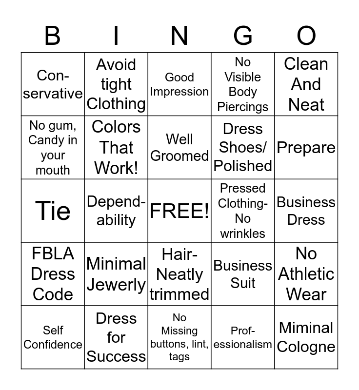 This bingo card has a free space and 24 words: Minimal Jewerly, Dress for Success, Well Groomed, Self Confidence, Clean And Neat, Con-servative, No gum, Candy in your mouth, Avoid tight Clothing, Pressed Clothing- No wrinkles, Hair- Neatly trimmed, Dress Shoes/ Polished, Tie, Business Suit, No Athletic Wear, Colors That Work!, Prof- essionalism, Business Dress, Good Impression, Prepare, Depend- ability, Miminal Cologne, FBLA Dress Code, No Visible Body Piercings and No Missing buttons, lint, tags.