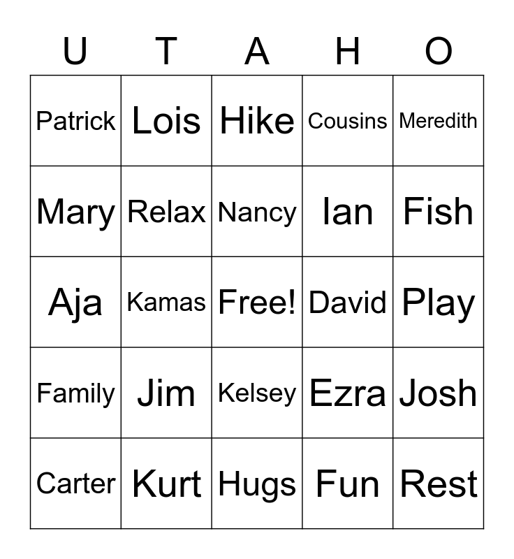 This bingo card has a free space and 24 words: Jim, Kurt, Nancy, Carter, Meredith, Patrick, Mary, Lois, David, Kelsey, Ian, Aja, Ezra, Josh, Relax, Fun, Play, Hike, Fish, Kamas, Rest, Family, Cousins and Hugs.