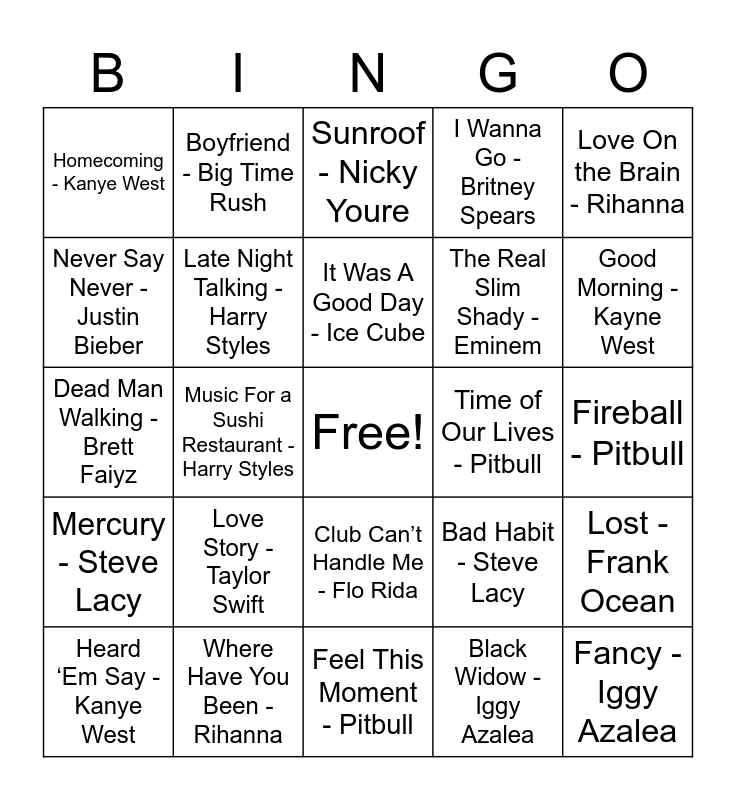 This bingo card has a free space and 30 words: Where Have You Been - Rihanna, Chicago - Michael Jackson, Music For a Sushi Restaurant - Harry Styles, Runaway - Kanye West, Homecoming - Kanye West, Sunroof - Nicky Youre, Late Night Talking - Harry Styles, Club Can’t Handle Me - Flo Rida, Time of Our Lives - Pitbull, Feel This Moment - Pitbull, Fireball - Pitbull, Fancy - Iggy Azalea, Black Widow - Iggy Azalea, Reggaeton Lento - CNCO, Good Morning - Kayne West, Viva la Vida - Coldplay, Bad Habit - Steve Lacy, Mercury - Steve Lacy, Love Story - Taylor Swift, Love On the Brain - Rihanna, Dead Man Walking - Brett Faiyz, Cigarette Daydreams - Cage The Elephant, Boyfriend - Big Time Rush, The Real Slim Shady - Eminem, Never Say Never - Justin Bieber, I Wanna Go - Britney Spears, Lost - Frank Ocean, Heard ‘Em Say - Kanye West, It Was A Good Day - Ice Cube and On The Floor - Jennifer Lopez.