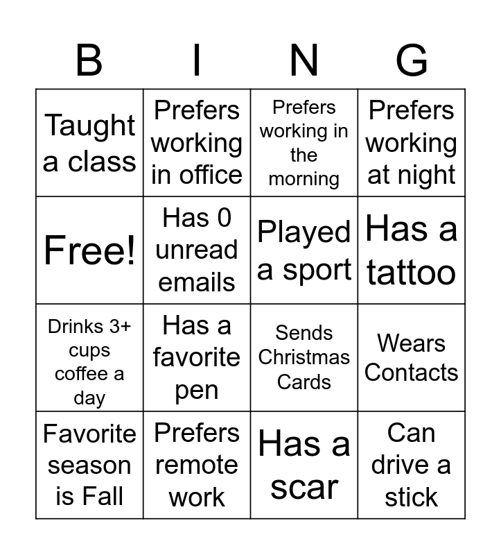 This bingo card has 16 words: Prefers remote work, Wears Contacts, Prefers working in the morning, Taught a class, Drinks 3+ cups coffee a day, Prefers working in office, Sends Christmas Cards, Has a scar, Free!, Has 0 unread emails, Favorite season is Fall, Prefers working at night, Has a favorite pen, Has a tattoo, Played a sport and Can drive a stick.