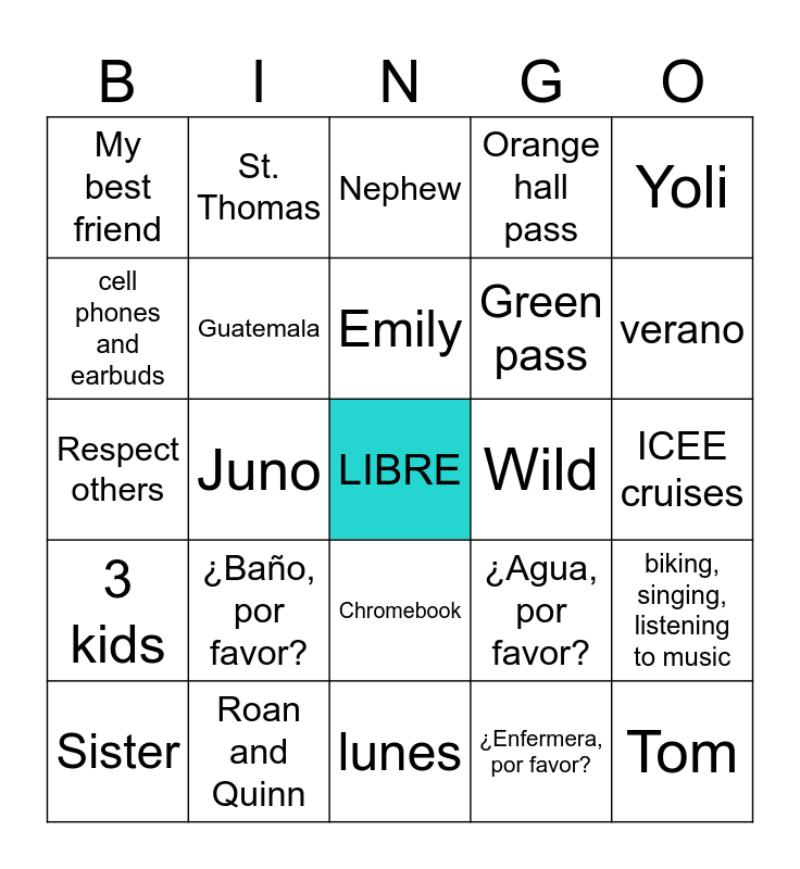 This bingo card has a free space and 32 words: ¿Enfermera, por favor?, ¿Casillero, por favor?, Juno, Callum, 3 kids, Guatemala, Yoli, biking, singing, listening to music, St. Thomas, Brooklyn Center, Emily, Nephew, Mom, brother, Wild, Park Center, Sister, Respect others, Chromebook, ¿Baño, por favor?, ¿Agua, por favor?, Katie, ICEE cruises, Roan and Quinn, Tom, Orange hall pass, Green pass, cell phones and earbuds, My best friend, lunes, domingo and verano.