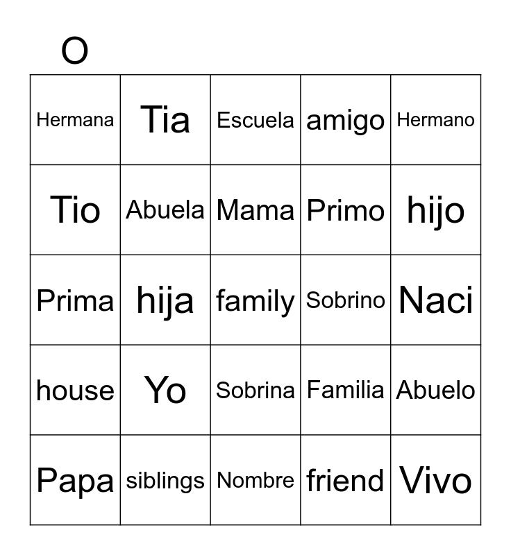 This bingo card has 25 words: Yo, Nombre, Mama, Papa, Hermano, Hermana, Tio, Tia, Sobrino, Sobrina, Primo, Prima, Familia, Abuelo, Abuela, Vivo, Naci, Escuela, hijo, hija, family, siblings, house, amigo and friend.