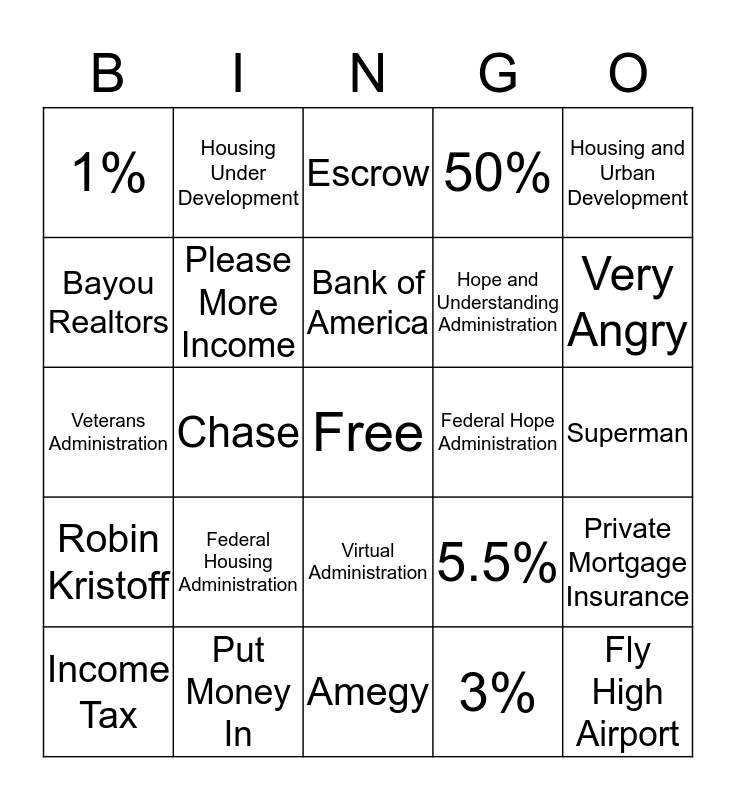 This bingo card has a free space and 24 words: Federal Housing Administration, Put Money In, Bank of America, Income Tax, Housing and Urban Development, 1%, Bayou Realtors, Housing Under Development, Federal Hope Administration, Virtual Administration, Hope and Understanding Administration, Veterans Administration, 5.5%, Private Mortgage Insurance, Please More Income, 3%, Superman, Escrow, Very Angry, Chase, Fly High Airport, Robin Kristoff, 50% and Amegy.