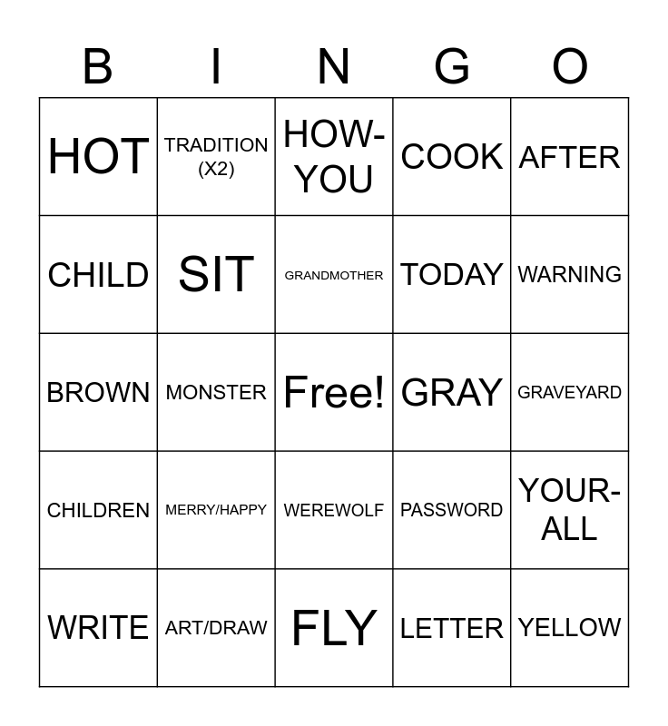 This bingo card has a free space and 26 words: WEREWOLF, LETTER, GRANDMOTHER, ART/DRAW, AFTER, HOT, CHILD, TRADITION (X2), GRAVEYARD, PASSWORD, TODAY, BROWN, YOUR-ALL, WRITE, MONSTER, CELSIUS, COOK, CHILDREN, HOW-YOU, YELLOW, WARNING, FLY, GRAY, MERRY/HAPPY, SIT and BOY.