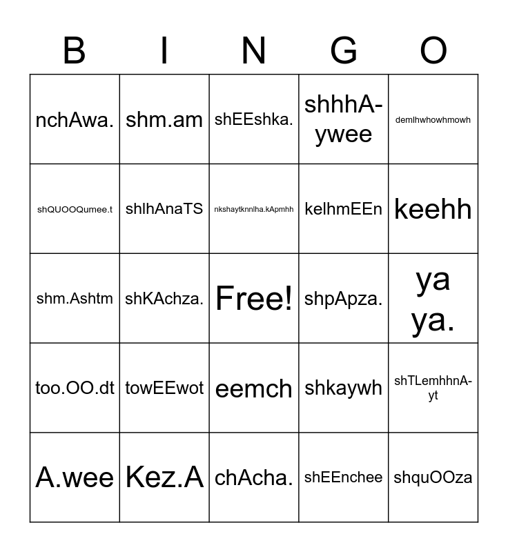 This bingo card has a free space and 29 words: A.wee, shkEEhhza., shKAchza., shquooz, nchAwa., shEEshka., shlhAnaTS, towEEwot, shpApza., Kez.A, ya ya., shquOOza, chAcha., shEEnchee, keehh, kachk, eemch, too.OO.dt, demlhwhowhmowh, shm.Ashtm, shkaywh, shmOOlhach, kelhmEEn, shQUOOQumee.t, shhhA-ywee, shm.am, shTLemhhnA-yt, nkshaytknnlha.kApmhh and quOOqubee..