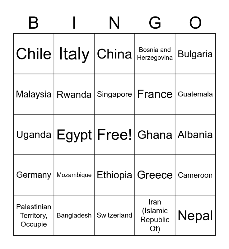 This bingo card has a free space and 69 words: Afghanistan, Albania, Argentina, Australia, Bangladesh, Bhutan, Bosnia and Herzegovina, Brazil, Bulgaria, Cambodia, Cameroon, Canada, Chile, China, Colombia, Egypt, Ethiopia, France, Georgia, Germany, Ghana, Greece, Guatemala, Honduras, Hong Kong, Hungary, India, Indonesia, Iran (Islamic Republic Of), Ireland, Italy, Japan, Jordan, Kazakhstan, Kenya, Korea, Republic of, Kosovo, Madagascar, Malaysia, Mexico, Mozambique, Nepal, Netherlands, Nigeria, Pakistan, Palestinian Territory, Occupie, Peru, Philippines, Romania, Rwanda, Singapore, Slovenia, Sri Lanka, Switzerland, Taiwan, Tanzania, Thailand, Tunisia, Turkey, Uganda, Ukraine, United Kingdom, Uzbekistan, Venezuela, Viet Nam, Zimbabwe, Yemen, Mongolia and Morocco.