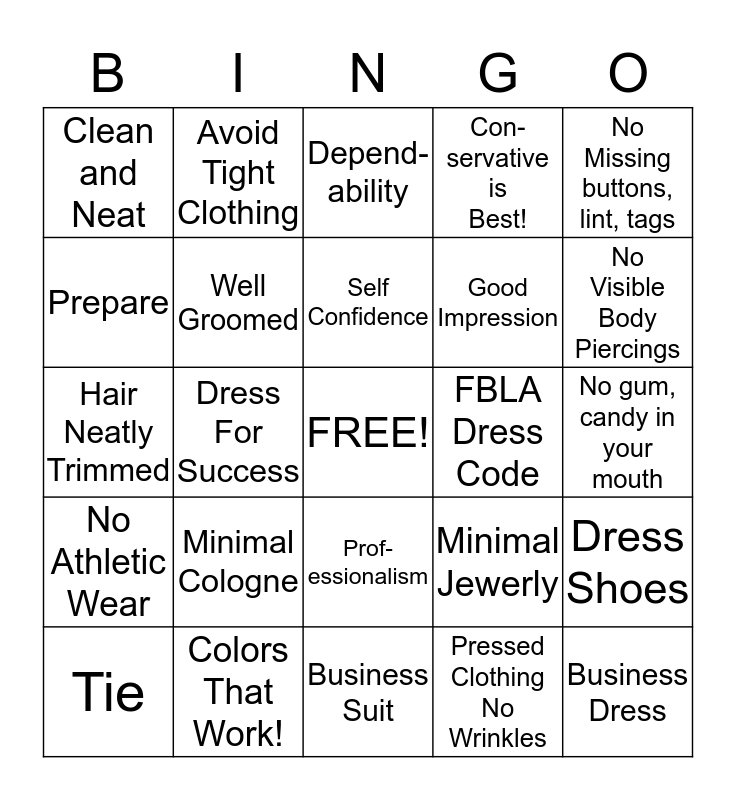 This bingo card has a free space and 24 words: Minimal Cologne, Colors That Work!, Self Confidence, Tie, No Missing buttons, lint, tags, Clean and Neat, Prepare, Avoid Tight Clothing, FBLA Dress Code, Prof- essionalism, Good Impression, Hair Neatly Trimmed, Minimal Jewerly, Dress Shoes, Well Groomed, Pressed Clothing No Wrinkles, No gum, candy in your mouth, Depend- ability, No Visible Body Piercings, Dress For Success, Business Dress, No Athletic Wear, Con- servative is Best! and Business Suit.