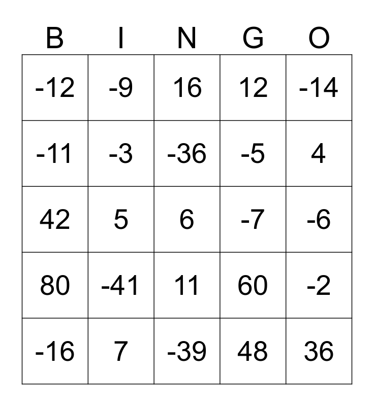 This bingo card has 25 words: -41, -39, -36, -16, -14, -12, -11, -9, -7, 11, -5, 42, 60, -2, -3, 36, -6, 16, 4, 5, 6, 7, 80, 12 and 48.