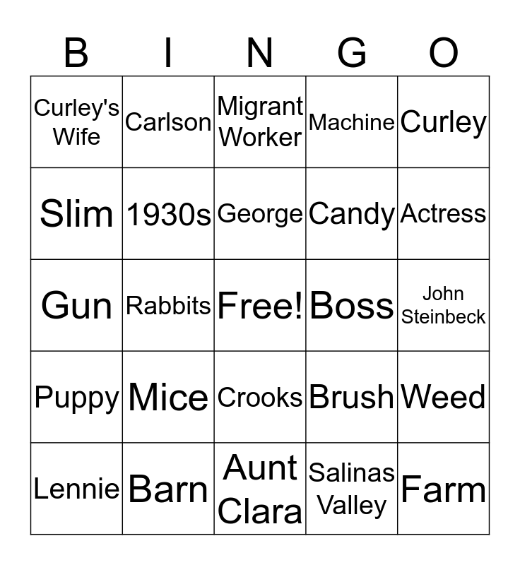 This bingo card has a free space and 24 words: Mice, Barn, George, Lennie, Curley, Curley's Wife, Slim, Carlson, Boss, Crooks, Candy, Gun, Brush, Weed, 1930s, Salinas Valley, John Steinbeck, Migrant Worker, Actress, Rabbits, Farm, Puppy, Machine and Aunt Clara.