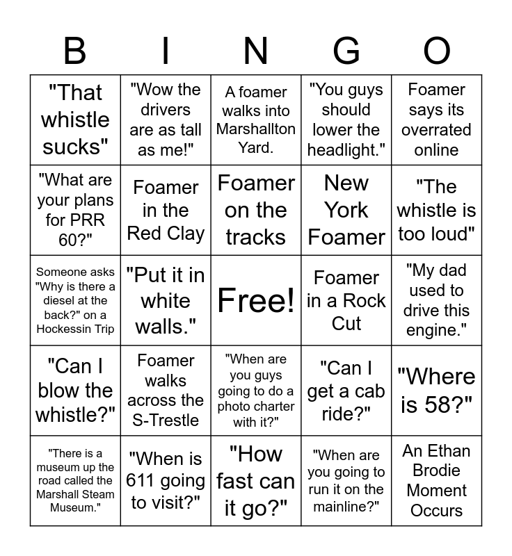This bingo card has a free space and 24 words: Foamer walks across the S-Trestle, "When is 611 going to visit?", Foamer on the tracks, "There is a museum up the road called the Marshall Steam Museum.", Foamer says its overrated online, "That whistle sucks", "What are your plans for PRR 60?", "Wow the drivers are as tall as me!", Foamer in a Rock Cut, "When are you guys going to do a photo charter with it?", New York Foamer, Someone asks "Why is there a diesel at the back?" on a Hockessin Trip, "Can I get a cab ride?", "Where is 58?", Foamer in the Red Clay, "When are you going to run it on the mainline?", "My dad used to drive this engine.", A foamer walks into Marshallton Yard., "The whistle is too loud", "Put it in white walls.", An Ethan Brodie Moment Occurs, "Can I blow the whistle?", "You guys should lower the headlight." and "How fast can it go?".