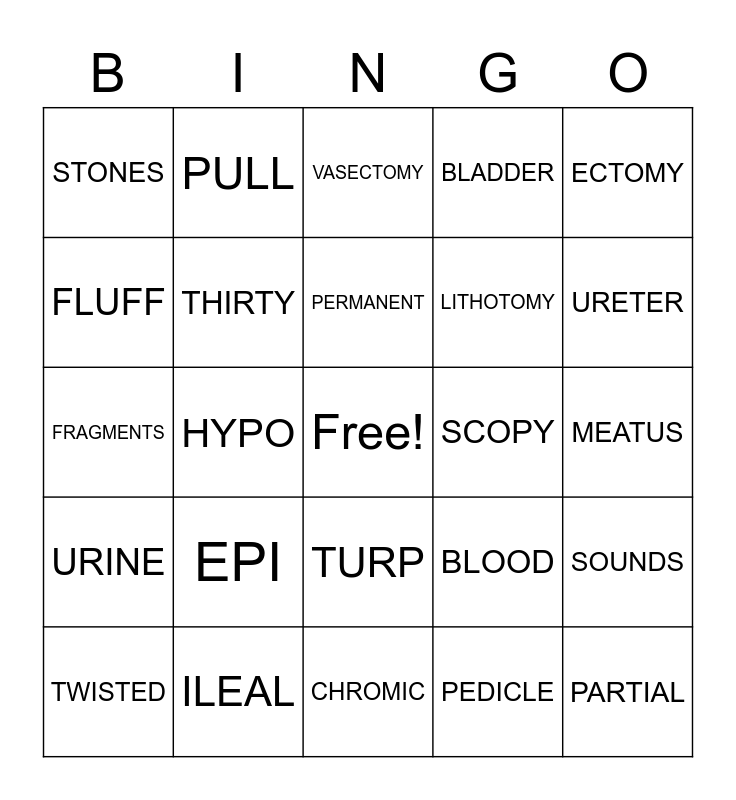 This bingo card has a free space and 25 words: EPI, CHROMIC, PERMANENT, TWISTED, ECTOMY, STONES, FLUFF, PULL, SCOPY, TURP, LITHOTOMY, FRAGMENTS, BLOOD, SOUNDS, THIRTY, SPASM, MEATUS, VASECTOMY, URETER, HYPO, PARTIAL, ILEAL, URINE, BLADDER and PEDICLE.
