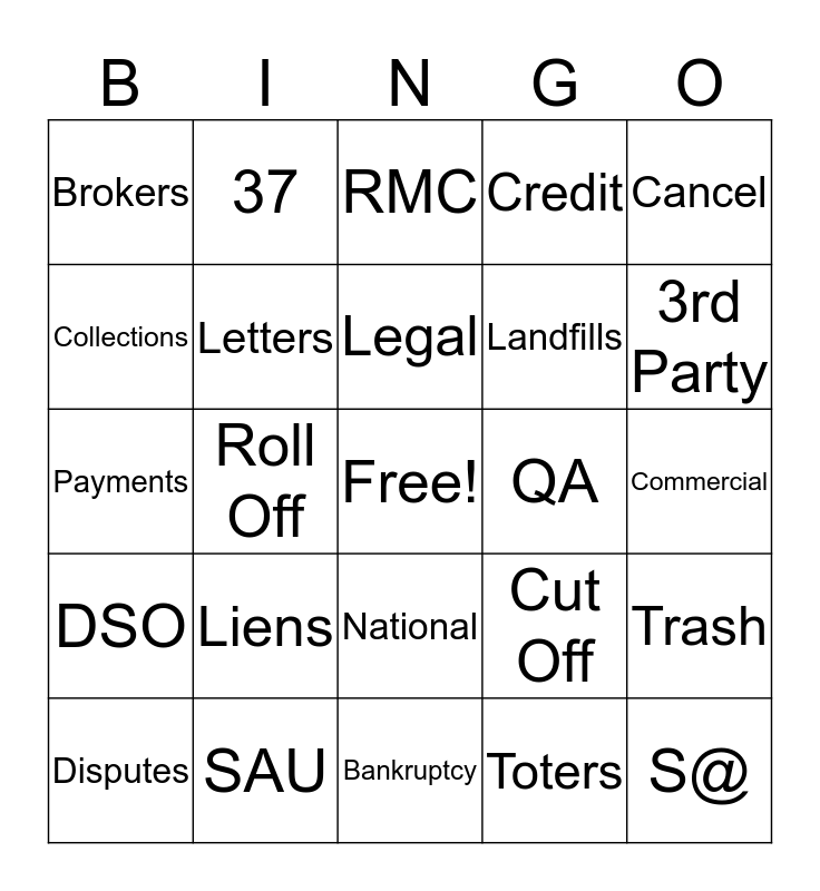 This bingo card has a free space and 28 words: Trash, Waste Management, Landfills, Toters, Collections, RMC, 37, DSO, QA, Disputes, Payments, Credit, SAU, Bankruptcy, 3rd Party, Tax Roll, Liens, Letters, Legal, National, Brokers, GC, S@, Roll Off, Commercial, Cut Off, Cancel and Write Off.