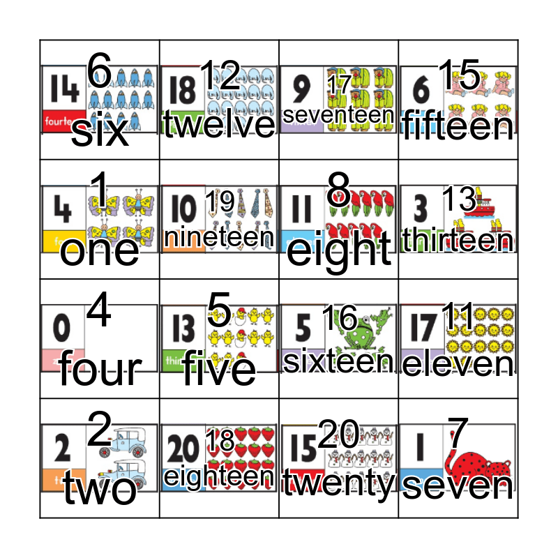 This bingo card has 15 images, a free space and 15 words: 2 two, 7 seven, 17 seventeen, 6 six, 13 thirteen, 1 one, 5 five, 20 twenty, 19 nineteen, 4 four, 11 eleven, 15 fifteen, 8 eight, 12 twelve and 18 eighteen.