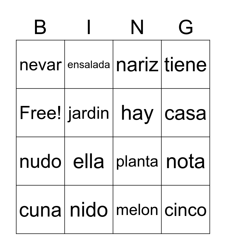 This bingo card has 16 words: nido, nota, nariz, nevar, nudo, ensalada, planta, melon, Free!, jardin, cuna, tiene, ella, casa, hay and cinco.