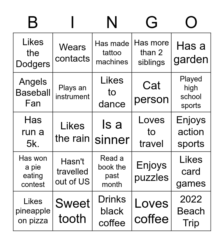 This bingo card has a free space and 29 words: Likes pineapple on pizza, Has twins, Likes the rain, Loves tacos, Likes the Dodgers, Has made tattoo machines, Plays an instrument, Hasn't travelled out of US, Loves to travel, Sweet tooth, Enjoys action sports, 2022 Beach Trip, Drinks black coffee, Loves coffee, Played high school sports, Has adult kid(s), Read a book the past month, Has won a pie eating contest, Has a garden, Has run a 5k., Enjoys puzzles, Dog person, Cat person, Angels Baseball Fan, Has more than 2 siblings, Wears contacts, Likes card games, Likes to dance and Has served in the military.