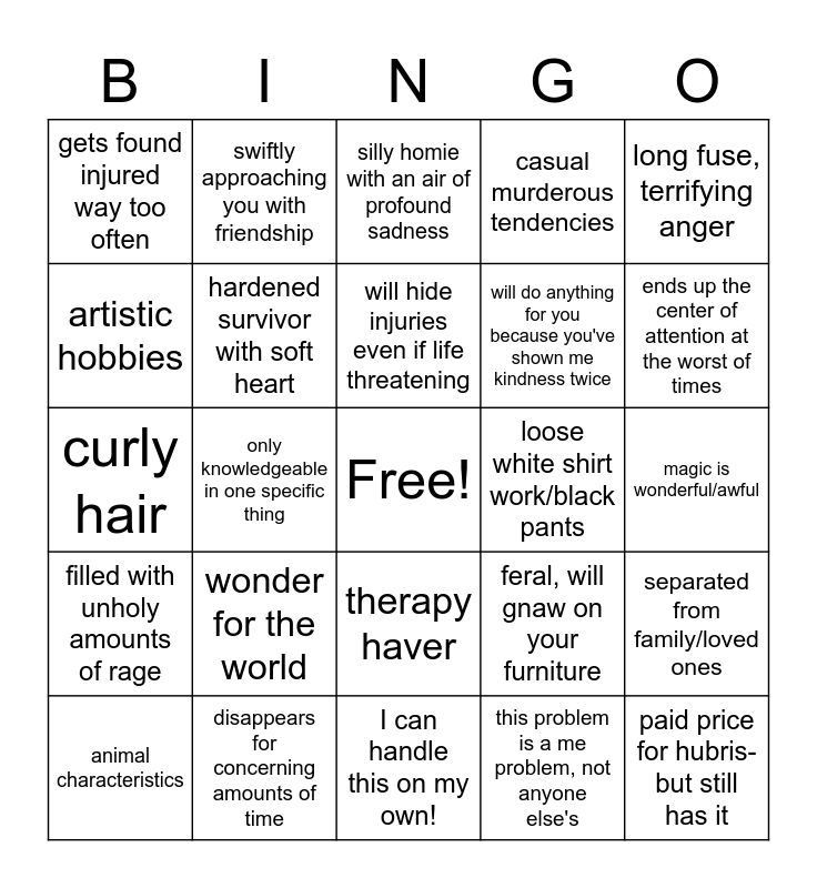 This bingo card has a free space and 29 words: animal characteristics, grew up too fast, only knowledgeable in one specific thing, against authority, gets found injured way too often, silly homie with an air of profound sadness, hardened survivor with soft heart, wonder for the world, loose white shirt work/black pants, disappears for concerning amounts of time, magic is wonderful/awful, paid price for hubris- but still has it, I can handle this on my own!, this problem is a me problem, not anyone else's, ends up the center of attention at the worst of times, therapy causer, therapy haver, filled with unholy amounts of rage, long fuse, terrifying anger, curly hair, feral, will gnaw on your furniture, workaholic, will do anything for you because you've shown me kindness twice, artistic hobbies, casual murderous tendencies, swiftly approaching you with friendship, separated from family/loved ones, will hide injuries even if life threatening and animals are my friends :].