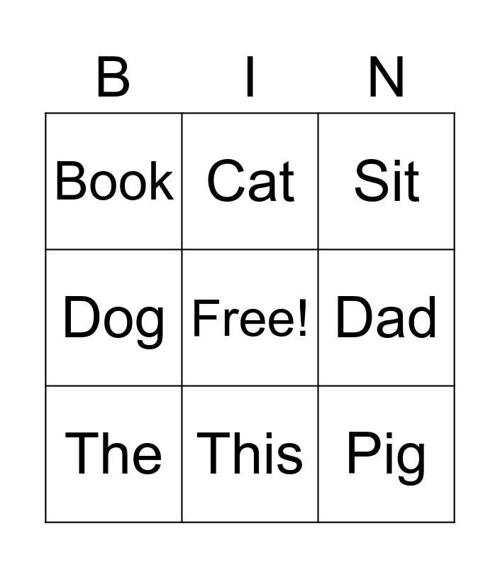 This bingo card has a free space and 8 words: Dad, Sit, Cat, The, Book, Pig, Dog and This.