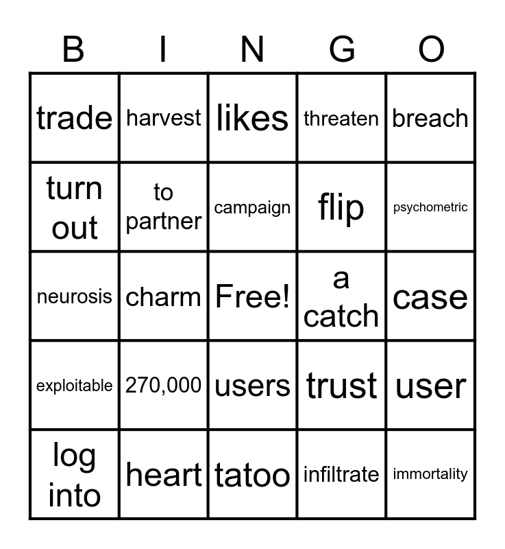 This bingo card has a free space and 34 words: target, infiltrate, traits, a catch, exploitable, to partner, breach, log into, harvest, fraud, campaign, likes, partnered, inocuous, a catch, psychometric, heart, neurosis, 270,000, trust, users, messaging, trade, case, tatoo, immortality, threaten, figure out, flip, turn out, indiscreet, charm, user and provide.