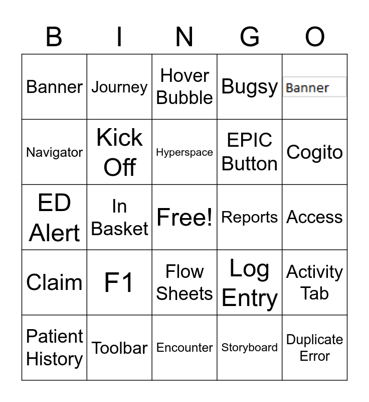 This bingo card has 1 images, a free space and 25 words: Flow Sheets, Storyboard, Hyperspace, Toolbar, Banner, Navigator, Journey, Access, Log Entry, EPIC Button, ED Alert, Activity Tab, Patient History, In Basket, Playground, Bugsy, Claim, Hover Bubble, Duplicate Error, Cogito, Encounter, Reports, F1, Kick Off and Galaxy.