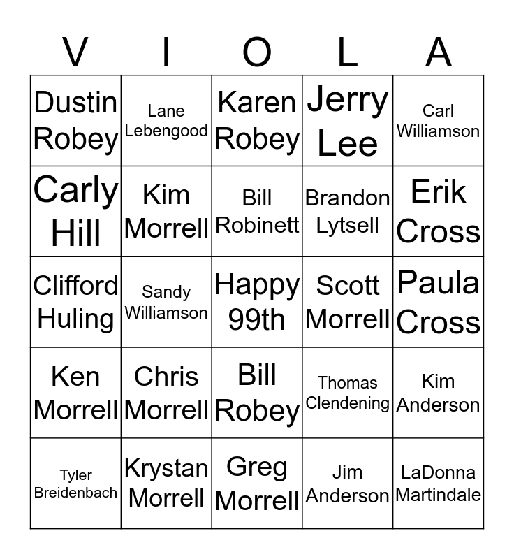 This bingo card has a free space and 42 words: Kathy Robinett, Bill Robinett, Donna Morrell, Chris Morrell, Jim Anderson, Kim Anderson, LaDonna Martindale, Gordon Martindale, Karen Robey, Bill Robey, Paula Cross, Erik Cross, Sandy Williamson, Carl Williamson, Heather Clendening, Thomas Clendening, Parker Clendening, Clifford Huling, Colton Popp, Lane Lebengood, Carly Hill, James Hill, Aaron Robey, Dustin Robey, Samantha Cross, Alex Cross, Brandon Lytsell, Erin Chartier, Jamie Chartier, Tonya Breidenbach, Howard Breidenbach, Ken Morrell, Kim Morrell, Greg Morrell, Hiedi Breidenbach, Tyler Breidenbach, Krystan Morrell, Scott Morrell, Jamie Anderson, Kim Anderson, Jerry Lee and Little Bit.
