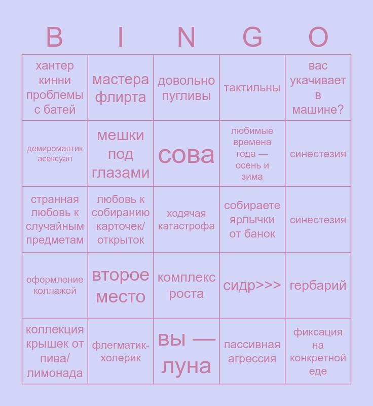 This bingo card has a free space and 24 words: коллекция крышек от пива/лимонада, второе место, сова, пассивная агрессия, вас укачивает в машине?, хантер кинни проблемы с батей, мастера флирта, довольно пугливы, собираете ярлычки от банок, синестезия, странная любовь к случайным предметам, мешки под глазами, сидр>>>, гербарий, демиромантик асексуал, флегматик-холерик, вы —луна, тактильны, синестезия, оформление коллажей, любовь к собиранию карточек/открыток, комплекс роста, любимые времена года — осень и зима and фиксация на конкретной еде.