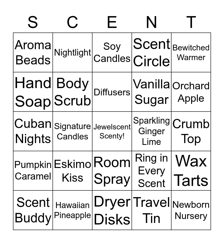 This bingo card has a free space and 24 words: Eskimo Kiss, Hawaiian Pineapple, Diffusers, Scent Buddy, Bewitched Warmer, Aroma Beads, Hand Soap, Nightlight, Sparkling Ginger Lime, Room Spray, Vanilla Sugar, Cuban Nights, Ring in Every Scent, Wax Tarts, Body Scrub, Travel Tin, Crumb Top, Soy Candles, Orchard Apple, Signature Candles, Newborn Nursery, Pumpkin Caramel, Scent Circle and Dryer Disks.