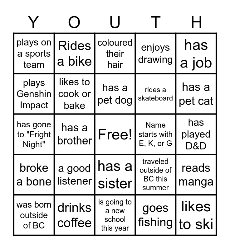 This bingo card has a free space and 24 words: a good listener, drinks coffee, has a pet dog, was born outside of BC, has a job, plays on a sports team, plays Genshin Impact, Rides a bike, Name starts with E, K, or G, has a sister, rides a skateboard, has gone to "Fright Night", traveled outside of BC this summer, reads manga, likes to cook or bake, goes fishing, has played D&D, coloured their hair, has a pet cat, has a brother, likes to ski, broke a bone, enjoys drawing and is going to a new school this year.