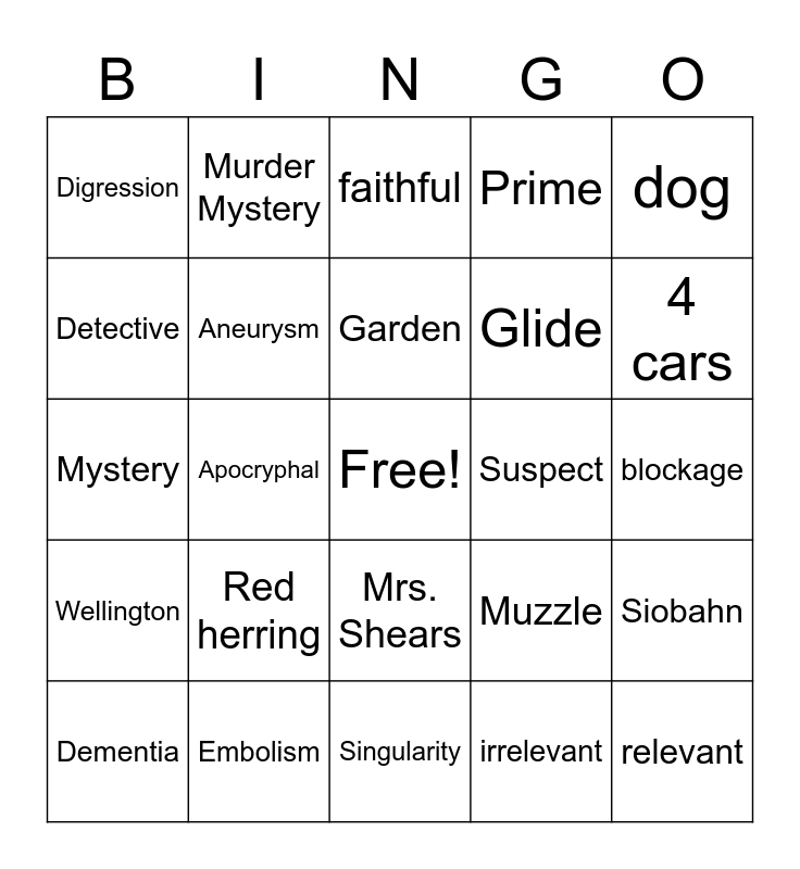 This bingo card has a free space and 29 words: Dementia, Slander, Apocryphal, Snooker, Digression, faithful, Aneurysm, Red herring, Suspect, Embolism, blockage, relevant, Singularity, irrelevant, 4 cars, Christopher, Mrs. Shears, Wellington, dog, Mystery, Muzzle, Arrested, Glide, Detective, Prime, Murder Mystery, Siobahn, Garden and Ms. Marshall's dogs.