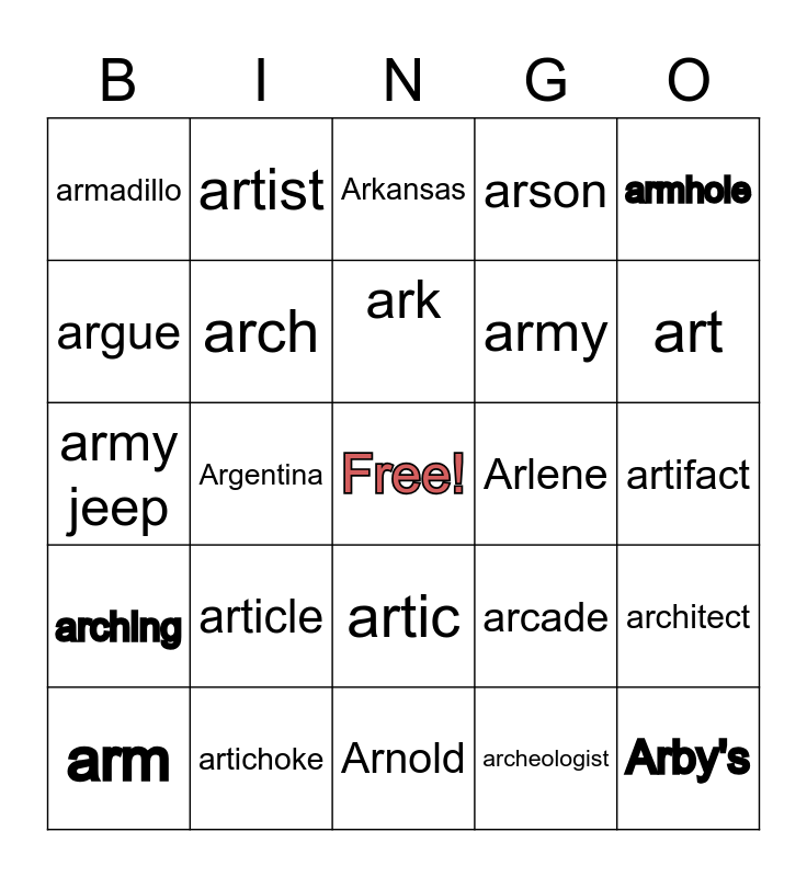 This bingo card has a free space and 24 words: arm, article, ark, archeologist, armhole, armadillo, artist, Arkansas, Arlene, artifact, army jeep, arch, arcade, architect, argue, artichoke, Arnold, arson, art, arching, Argentina, artic, army and Arby's.