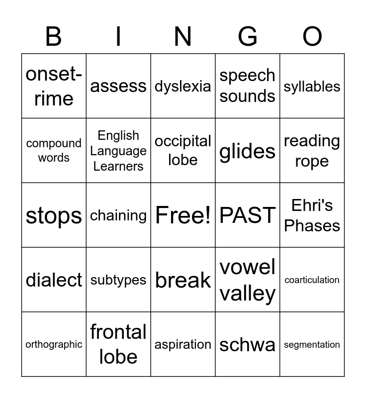 This bingo card has a free space and 24 words: subtypes, frontal lobe, occipital lobe, orthographic, syllables, onset-rime, compound words, assess, PAST, break, glides, stops, vowel valley, coarticulation, English Language Learners, schwa, Ehri's Phases, dyslexia, reading rope, chaining, segmentation, dialect, speech sounds and aspiration.