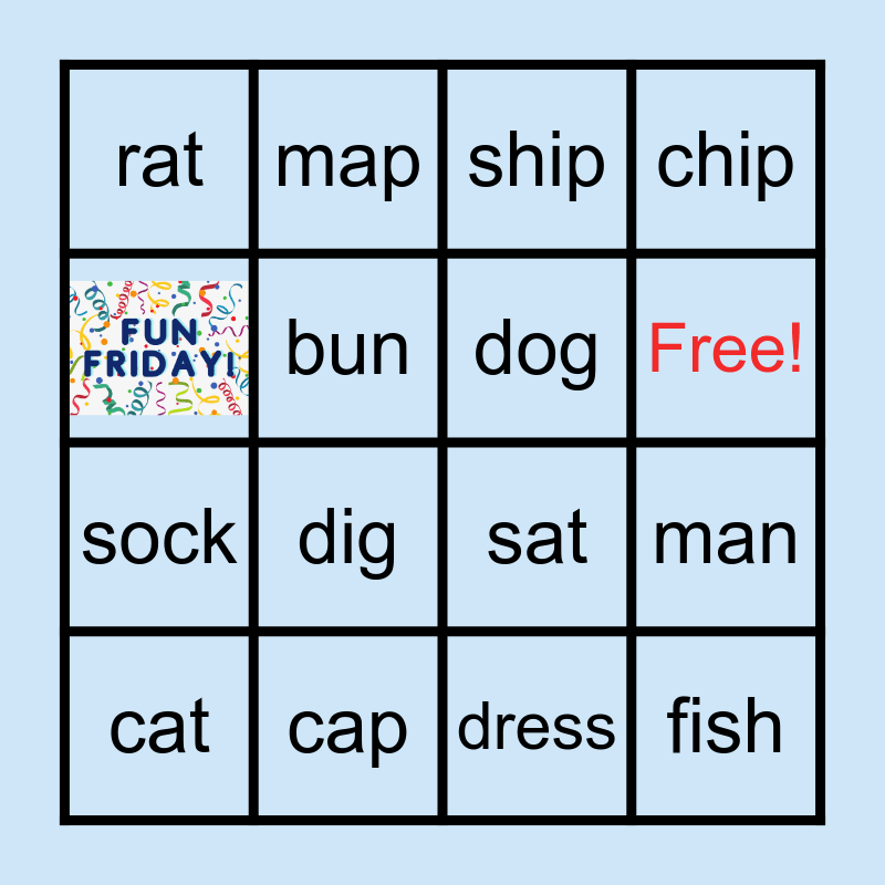 This bingo card has 1 images and 15 words: cap, man, ship, rat, sock, map, sat, dress, bun, cat, chip, dig, Free!, dog and fish.