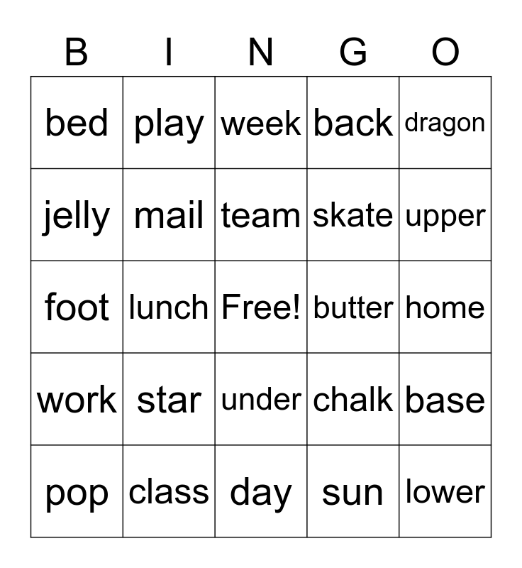 This bingo card has a free space and 24 words: star, class, team, pop, dragon, bed, jelly, play, butter, under, skate, foot, chalk, base, mail, sun, home, week, upper, lunch, lower, work, back and day.