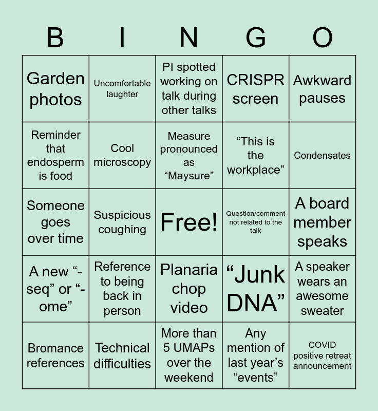 This bingo card has a free space and 24 words: Reference to being back in person, Technical difficulties, Measure pronounced as “Maysure”, Bromance references, Awkward pauses, Garden photos, Reminder that endosperm is food, Uncomfortable laughter, Question/comment not related to the talk, Planaria chop video, “This is the workplace”, Someone goes over time, “Junk DNA”, A speaker wears an awesome sweater, Cool microscopy, Any mention of last year’s “events”, A board member speaks, PI spotted working on talk during other talks, Condensates, Suspicious coughing, COVID positive retreat announcement, A new “-seq” or “-ome”, CRISPR screen and More than 5 UMAPs over the weekend.
