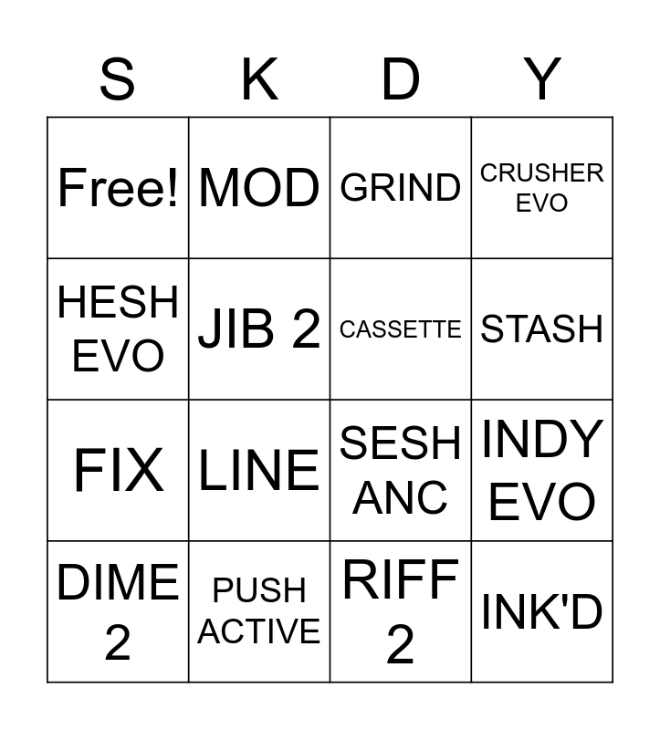 This bingo card has 16 words: DIME 2, PUSH ACTIVE, GRIND, CRUSHER EVO, HESH EVO, MOD, SESH ANC, INDY EVO, Free!, JIB 2, RIFF 2, STASH, FIX, LINE, CASSETTE and INK'D.